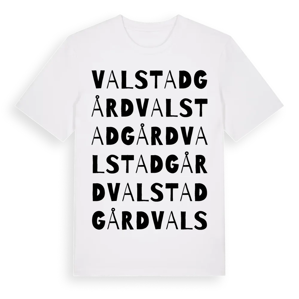 Valstad Gård ordlek t-shirt är inspirerad av byn Valstad Gård i Östergötlands län, Sverige. Tröjan är designad för dig som har en speciell koppling till platsen – oavsett om du bor här, har rötterna här eller bara älskar Valstad Gård.