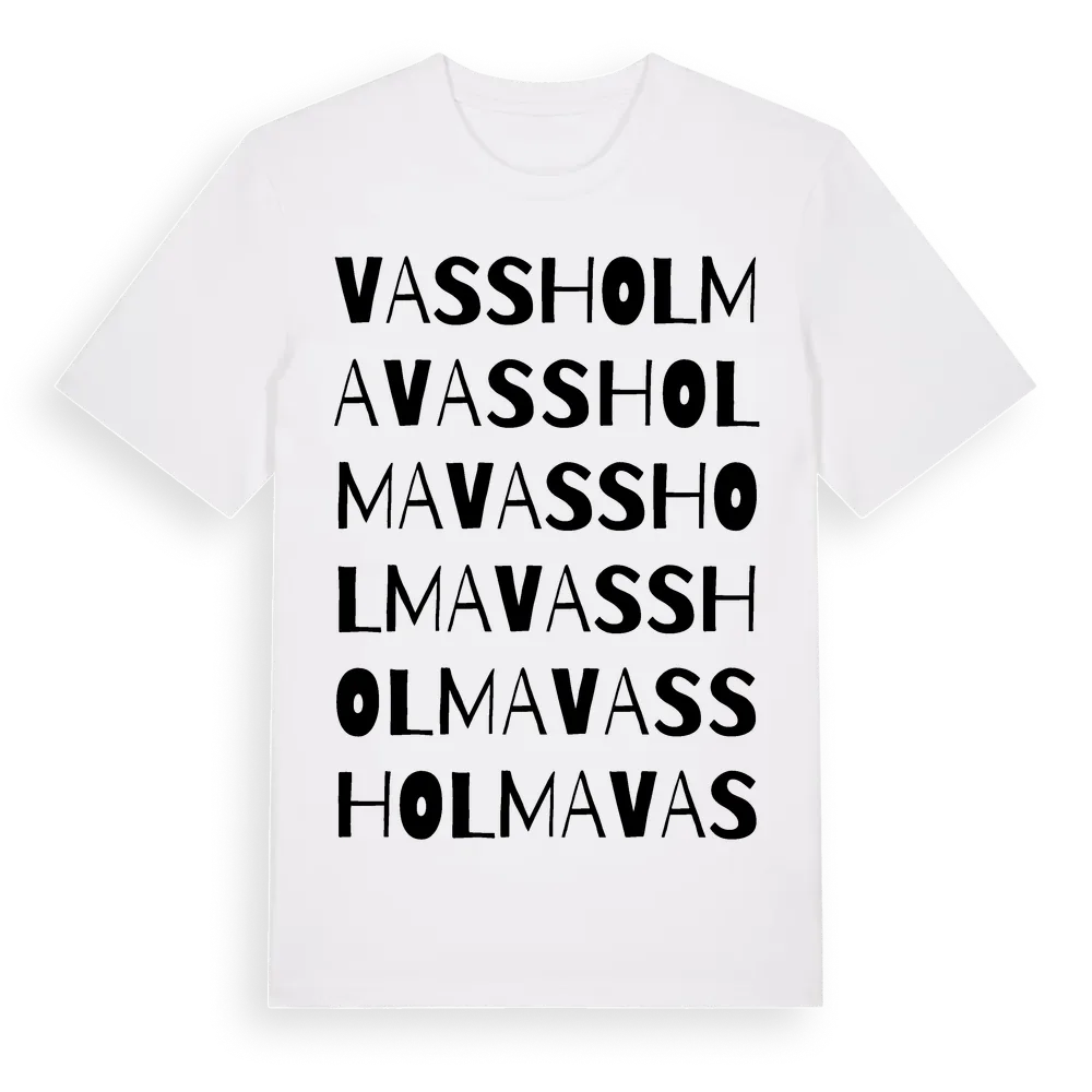 Vassholma ordlek t-shirt är inspirerad av byn Vassholma i Östergötlands län, Sverige. Tröjan är designad för dig som har en speciell koppling till platsen – oavsett om du bor här, har rötterna här eller bara älskar Vassholma.