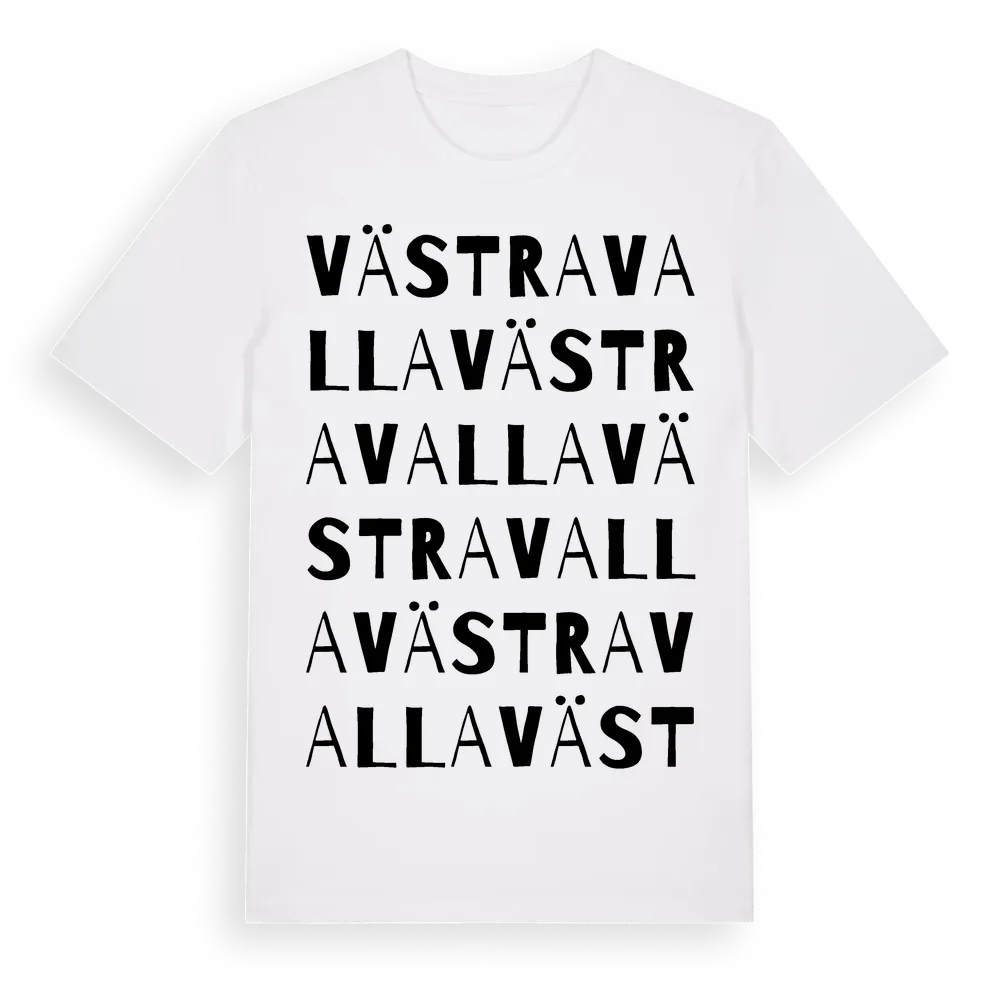 Västra Valla ordlek t-shirt är inspirerad av stadsdelen Västra Valla i Östergötlands län, Sverige. Tröjan är designad för dig som har en speciell koppling till platsen – oavsett om du bor här, har rötterna här eller bara älskar Västra Valla.