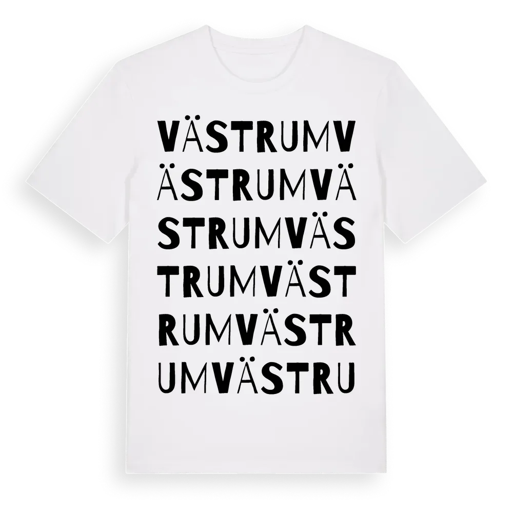 Västrum ordlek t-shirt är inspirerad av Västrum i Östergötlands län, Sverige. Tröjan är designad för dig som har en speciell koppling till platsen – oavsett om du bor här, har rötterna här eller bara älskar Västrum.