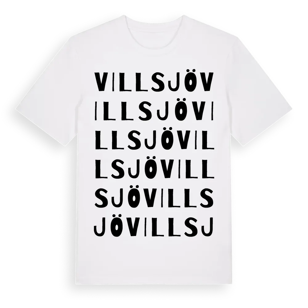 Villsjö ordlek t-shirt är inspirerad av Villsjö i Östergötlands län, Sverige. Tröjan är designad för dig som har en speciell koppling till platsen – oavsett om du bor här, har rötterna här eller bara älskar Villsjö.