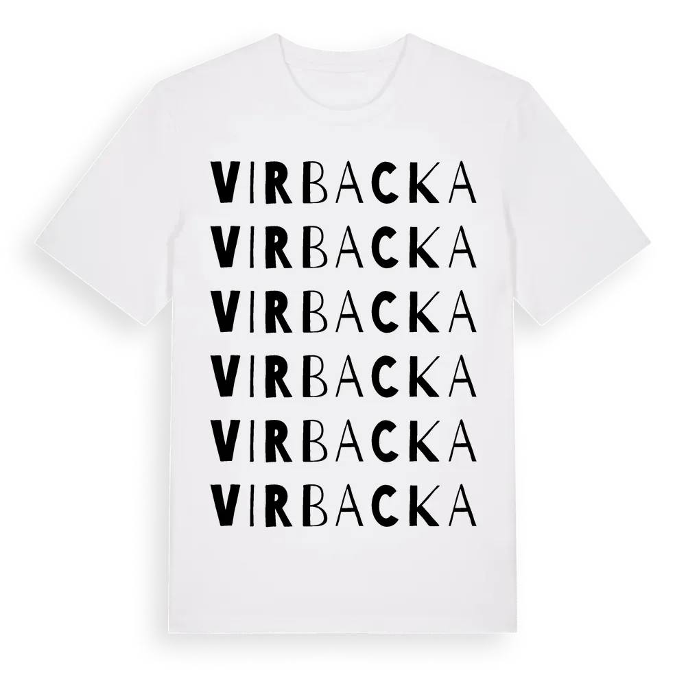 En ordlek byggd på Virbackas namn. Subtilt och klurig – ett motiv som bara de som verkligen känner platsen fullt ut förstår. Premium bomull, unisex – från Virbacka i Östergötlands län.