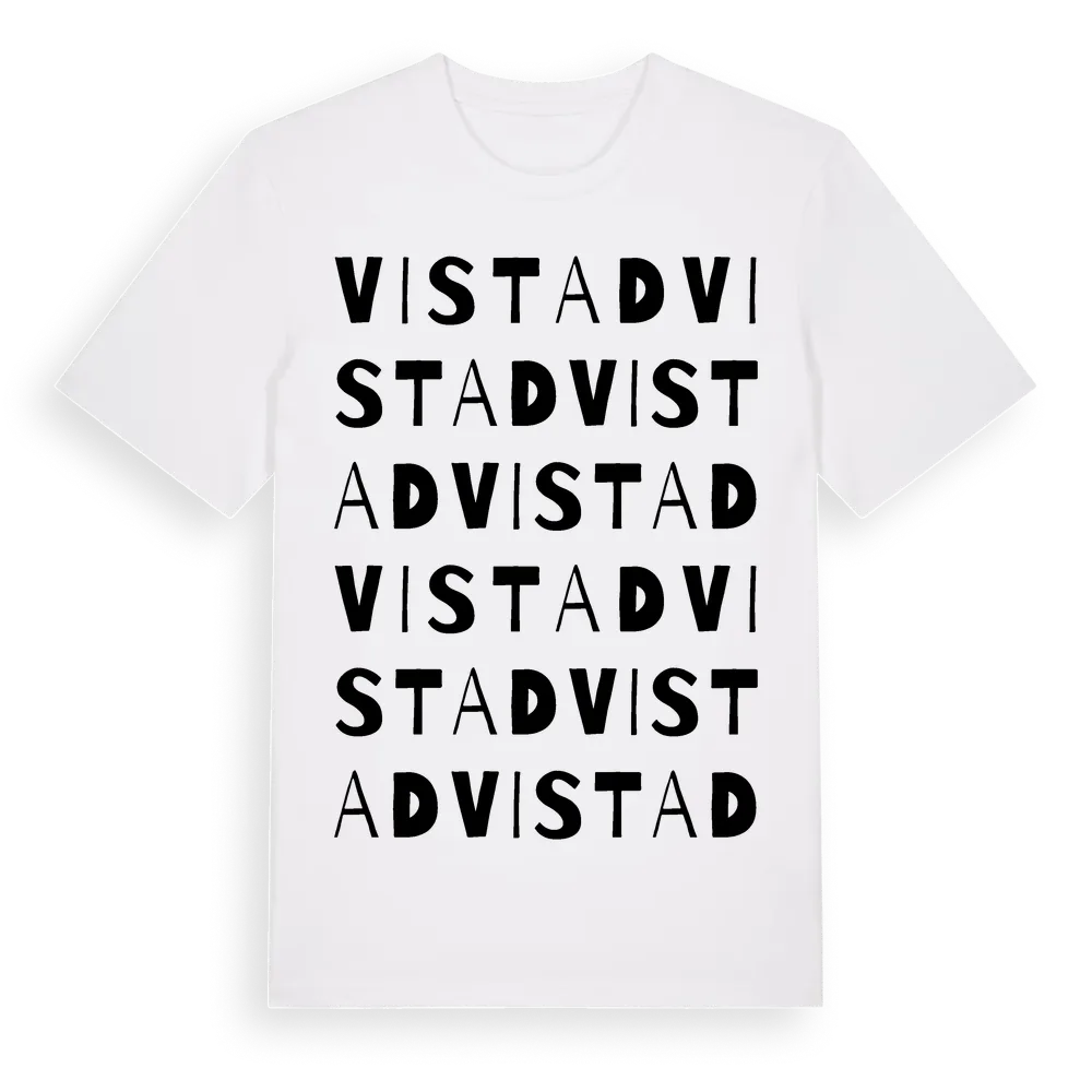 Vistad ordlek t-shirt är inspirerad av byn Vistad i Östergötlands län, Sverige. Tröjan är designad för dig som har en speciell koppling till platsen – oavsett om du bor här, har rötterna här eller bara älskar Vistad.
