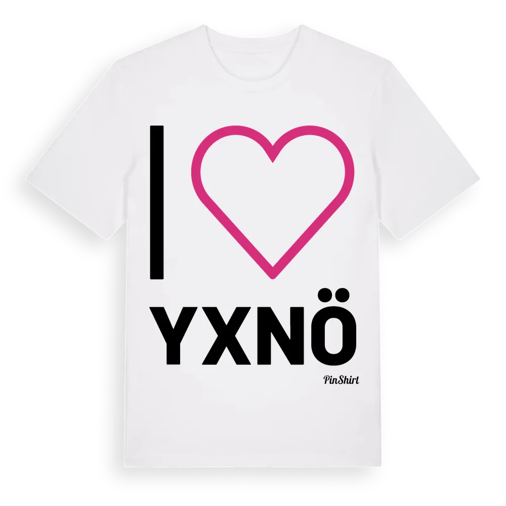 Det klassiska "I ❤ Yxnö"-motivet i stort format som täcker hela bröstet. För dig som vill visa kärleken till Yxnö på riktigt. Premium bomull, unisex – från byn Yxnö i Östergötlands län.