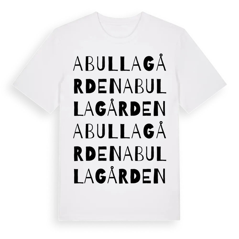 Abullagården ordlek t-shirt är inspirerad av Abullagården i Skåne län, Sverige. Tröjan är designad för dig som har en speciell koppling till platsen – oavsett om du bor här, har rötterna här eller bara älskar Abullagården.