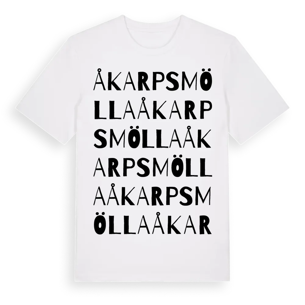 Åkarpsmölla ordlek t-shirt är inspirerad av Åkarpsmölla i Skåne län, Sverige. Tröjan är designad för dig som har en speciell koppling till platsen – oavsett om du bor här, har rötterna här eller bara älskar Åkarpsmölla.