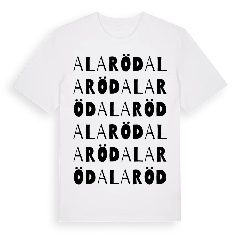 Alaröd ordlek t-shirt är inspirerad av Alaröd i Skåne län, Sverige. Tröjan är designad för dig som har en speciell koppling till platsen – oavsett om du bor här, har rötterna här eller bara älskar Alaröd.