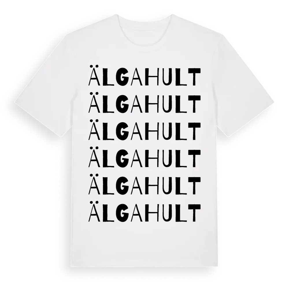 En ordlek byggd på Älgahults namn. Subtilt och klurig – ett motiv som bara de som verkligen känner platsen fullt ut förstår. Premium bomull, unisex – från Älgahult i Skåne län.