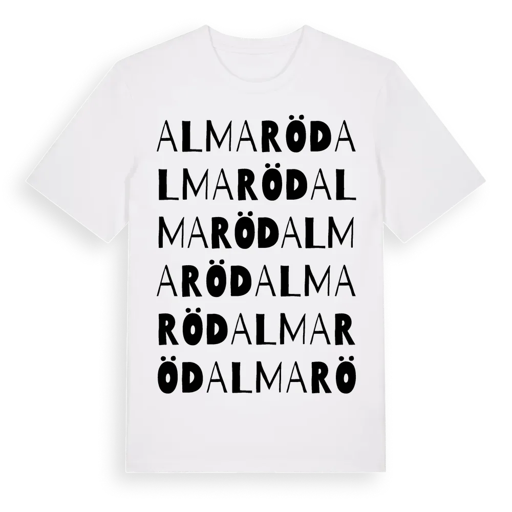Almaröd ordlek t-shirt är inspirerad av byn Almaröd i Skåne län, Sverige. Tröjan är designad för dig som har en speciell koppling till platsen – oavsett om du bor här, har rötterna här eller bara älskar Almaröd.