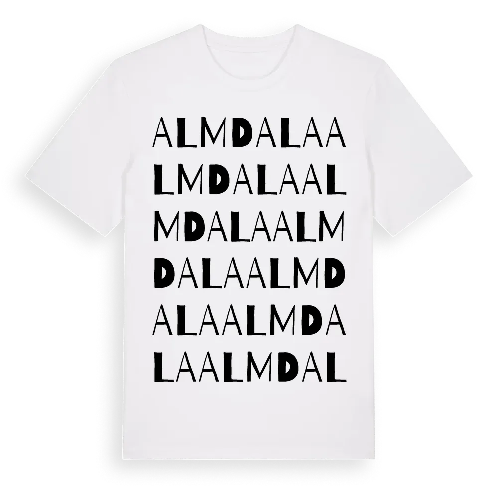 Almdala ordlek t-shirt är inspirerad av Almdala i Skåne län, Sverige. Tröjan är designad för dig som har en speciell koppling till platsen – oavsett om du bor här, har rötterna här eller bara älskar Almdala.