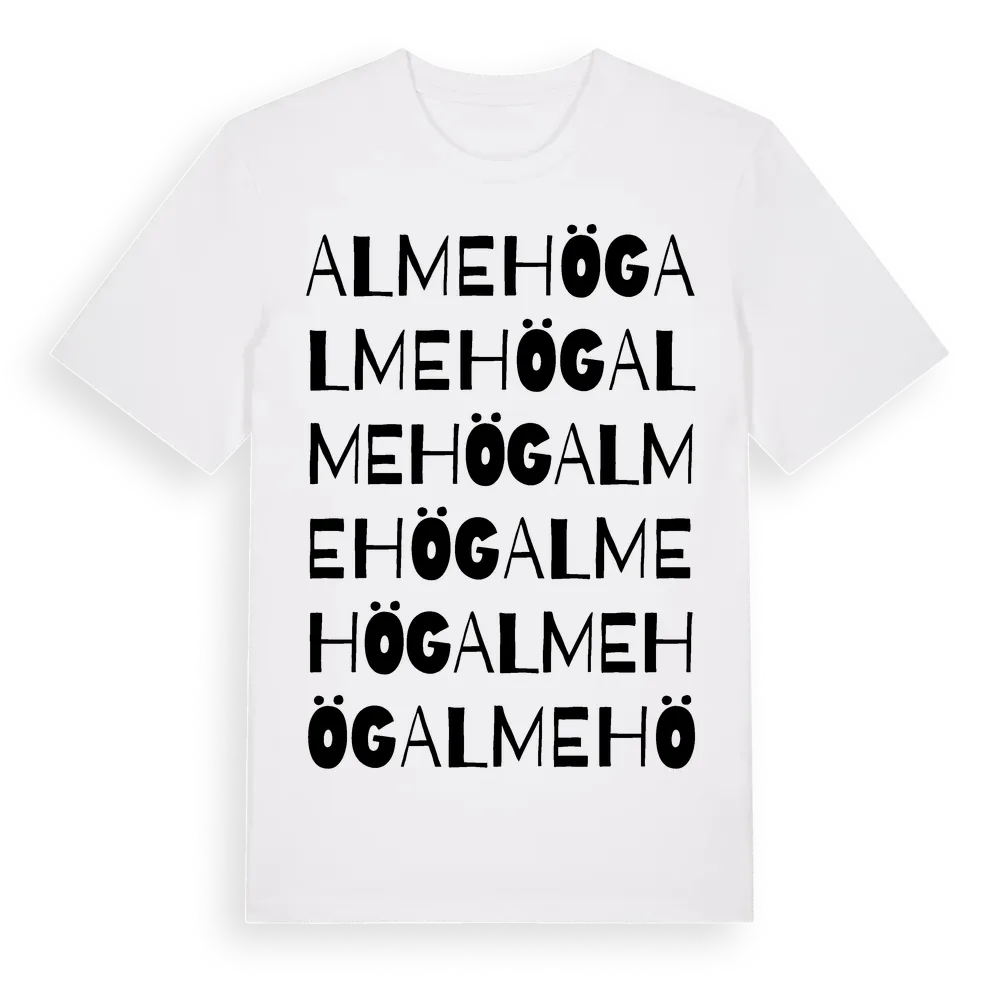 Almehög ordlek t-shirt är inspirerad av Almehög i Skåne län, Sverige. Tröjan är designad för dig som har en speciell koppling till platsen – oavsett om du bor här, har rötterna här eller bara älskar Almehög.