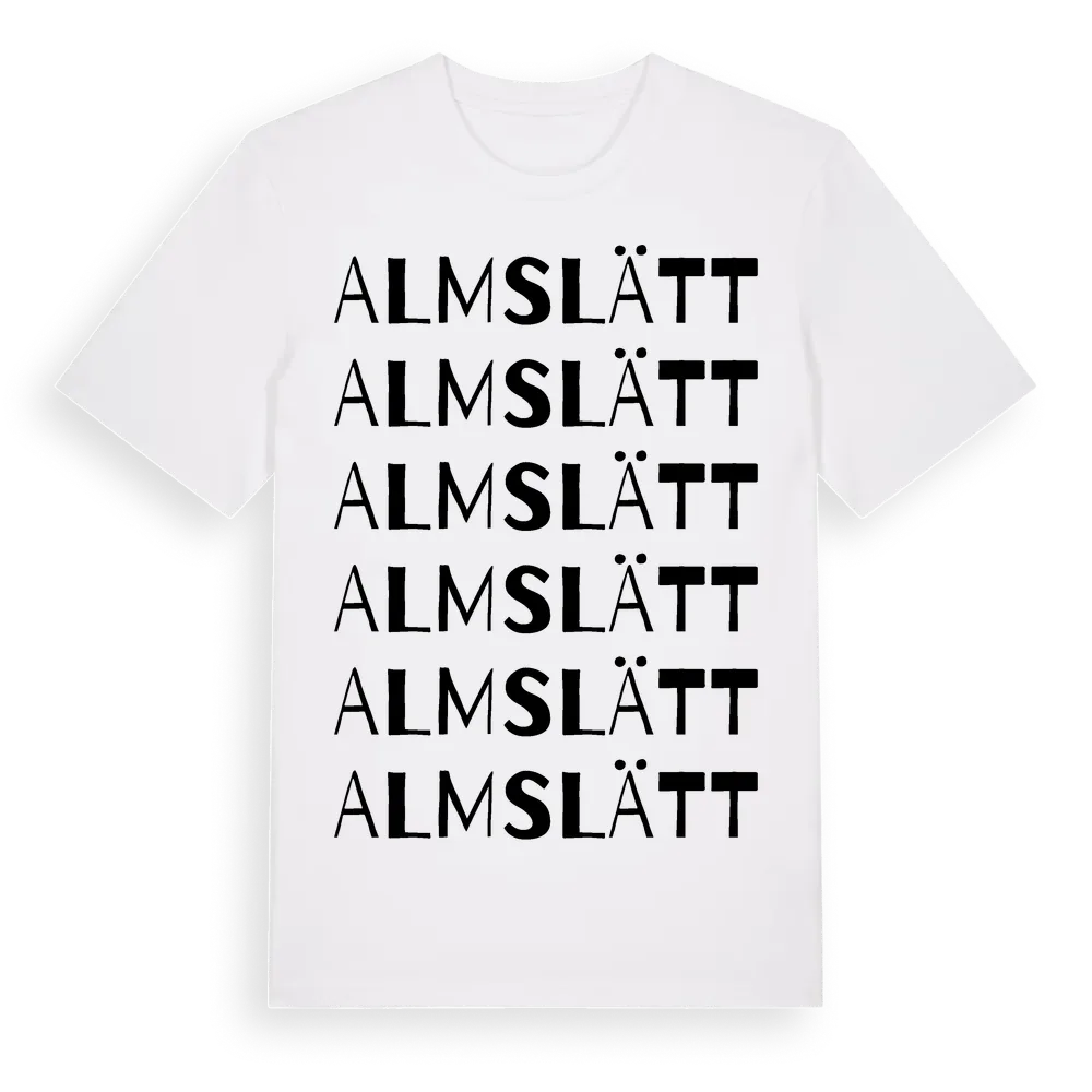 Almslätt ordlek t-shirt är inspirerad av Almslätt i Skåne län, Sverige. Tröjan är designad för dig som har en speciell koppling till platsen – oavsett om du bor här, har rötterna här eller bara älskar Almslätt.