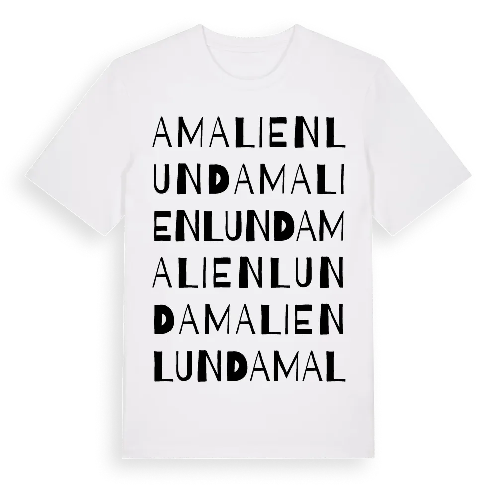 Amalienlund ordlek t-shirt är inspirerad av Amalienlund i Skåne län, Sverige. Tröjan är designad för dig som har en speciell koppling till platsen – oavsett om du bor här, har rötterna här eller bara älskar Amalienlund.
