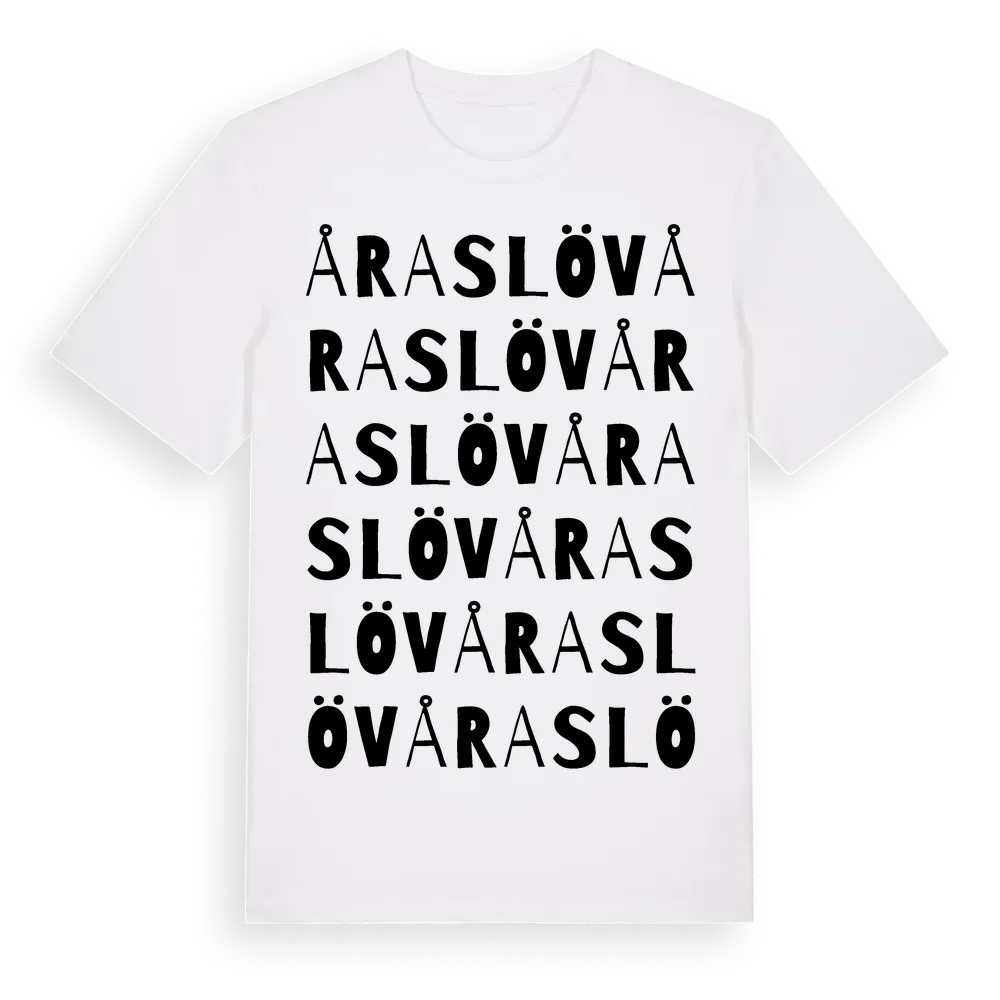 Åraslöv ordlek t-shirt är inspirerad av byn Åraslöv i Skåne län, Sverige. Tröjan är designad för dig som har en speciell koppling till platsen – oavsett om du bor här, har rötterna här eller bara älskar Åraslöv.