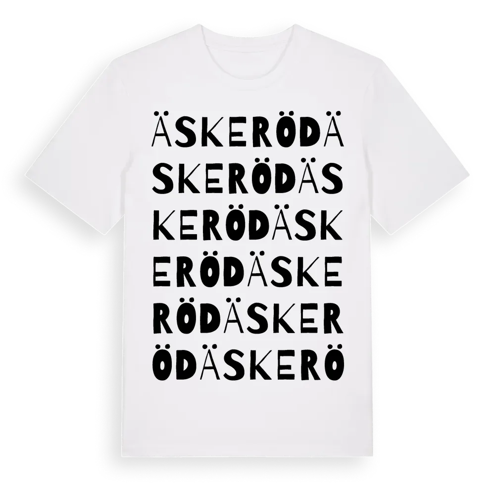 Äskeröd ordlek t-shirt är inspirerad av byn Äskeröd i Skåne län, Sverige. Tröjan är designad för dig som har en speciell koppling till platsen – oavsett om du bor här, har rötterna här eller bara älskar Äskeröd.