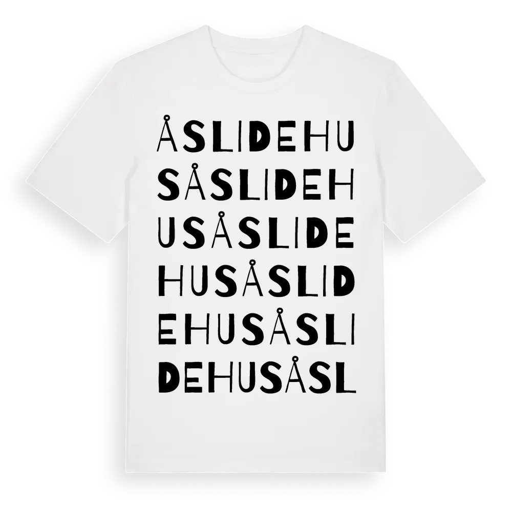 Åslidehus ordlek t-shirt är inspirerad av Åslidehus i Skåne län, Sverige. Tröjan är designad för dig som har en speciell koppling till platsen – oavsett om du bor här, har rötterna här eller bara älskar Åslidehus.