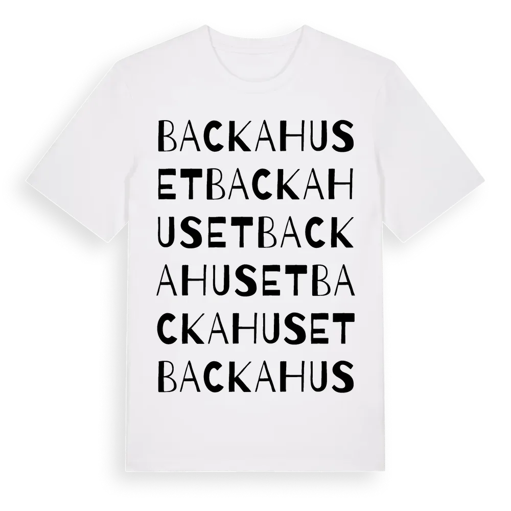 Backahuset ordlek t-shirt är inspirerad av Backahuset i Skåne län, Sverige. Tröjan är designad för dig som har en speciell koppling till platsen – oavsett om du bor här, har rötterna här eller bara älskar Backahuset.