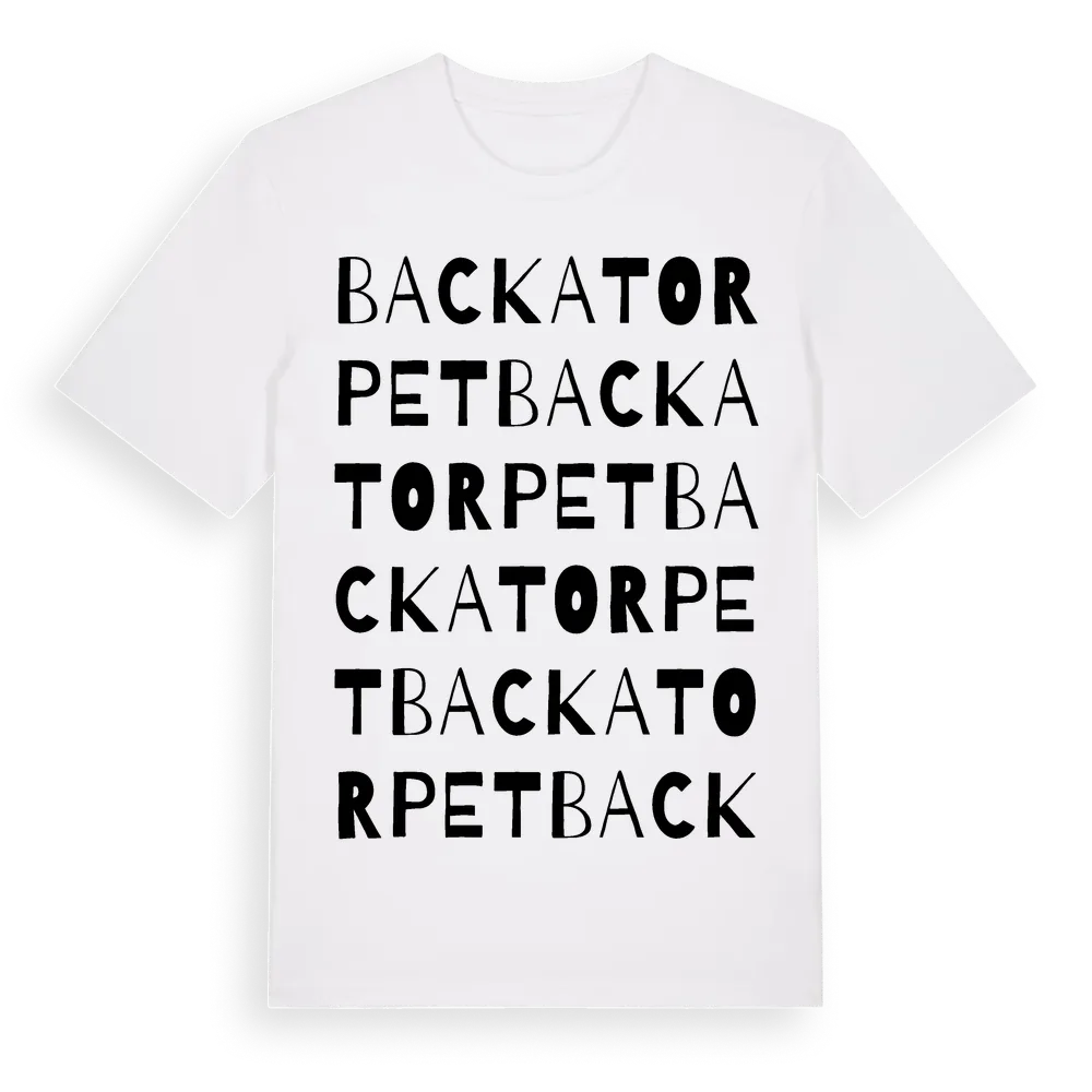 Backatorpet ordlek t-shirt är inspirerad av Backatorpet i Skåne län, Sverige. Tröjan är designad för dig som har en speciell koppling till platsen – oavsett om du bor här, har rötterna här eller bara älskar Backatorpet.