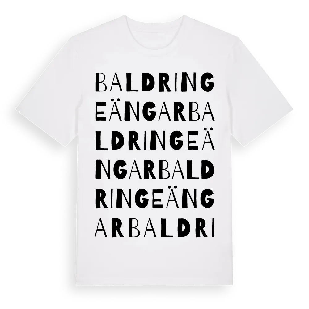 Baldringe Ängar ordlek t-shirt är inspirerad av Baldringe Ängar i Skåne län, Sverige. Tröjan är designad för dig som har en speciell koppling till platsen – oavsett om du bor här, har rötterna här eller bara älskar Baldringe Ängar.