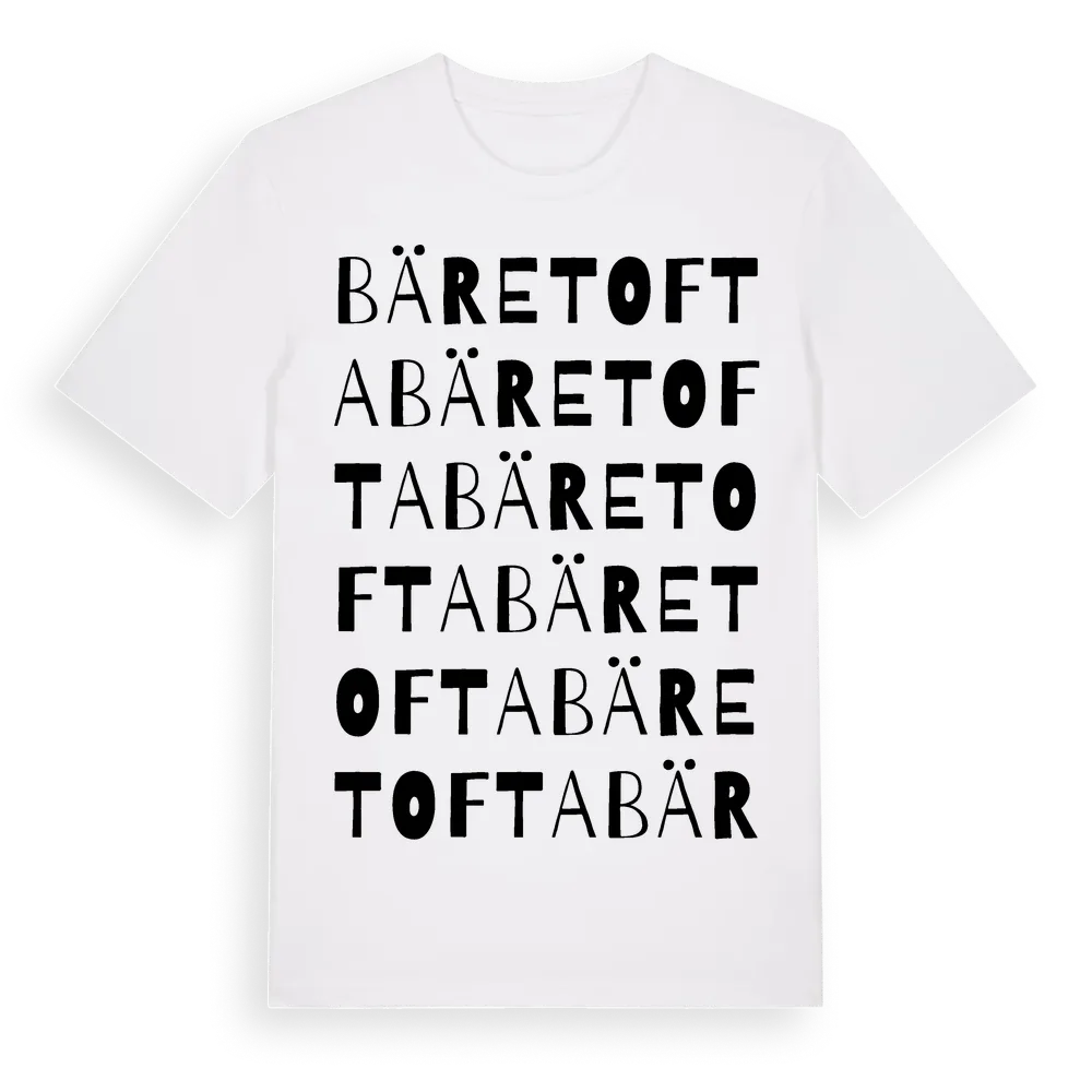 Bäretofta ordlek t-shirt är inspirerad av Bäretofta i Skåne län, Sverige. Tröjan är designad för dig som har en speciell koppling till platsen – oavsett om du bor här, har rötterna här eller bara älskar Bäretofta.