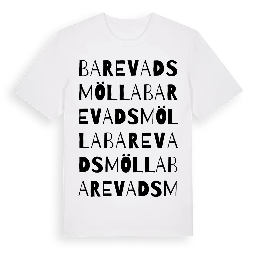 Barevadsmölla ordlek t-shirt är inspirerad av Barevadsmölla i Skåne län, Sverige. Tröjan är designad för dig som har en speciell koppling till platsen – oavsett om du bor här, har rötterna här eller bara älskar Barevadsmölla.