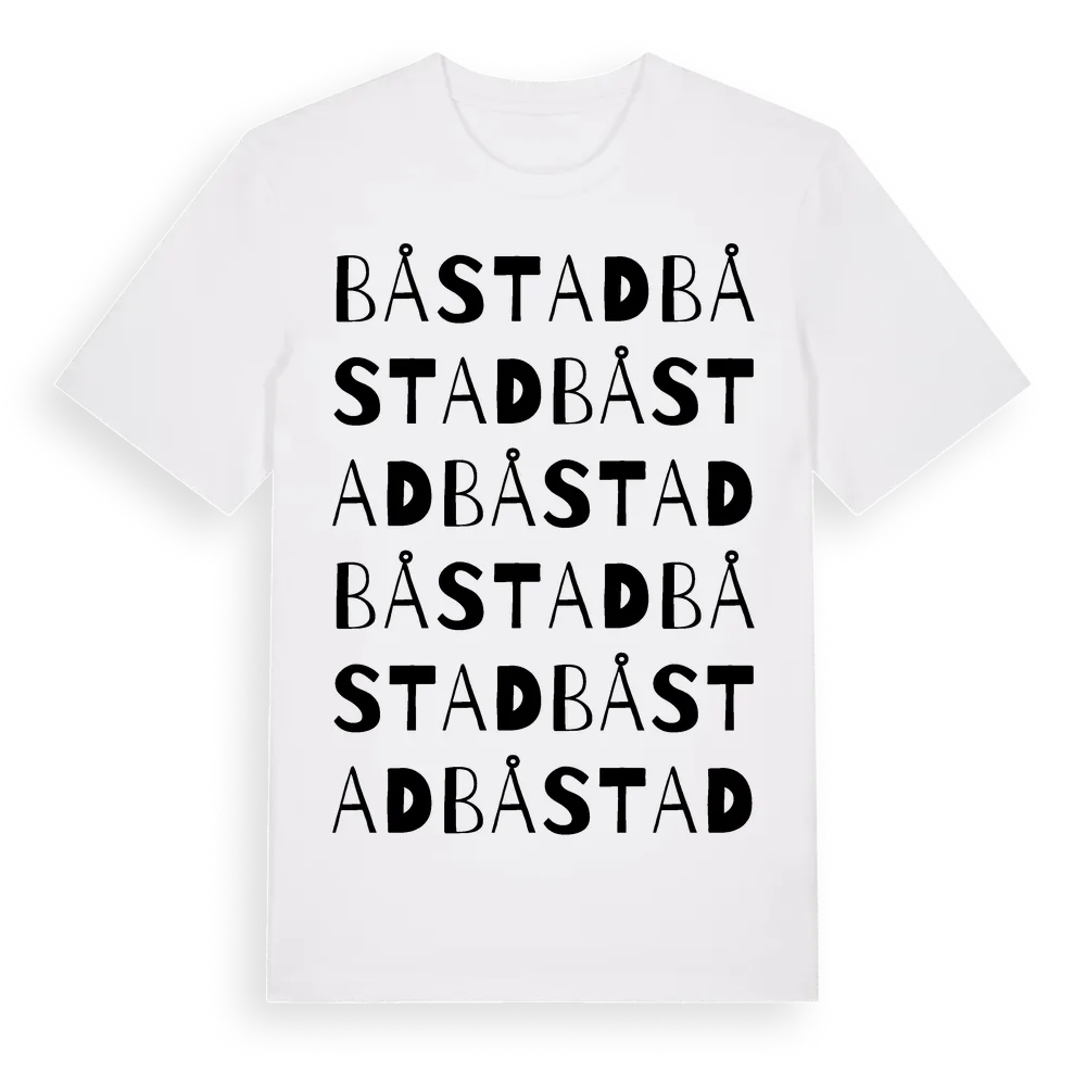 Båstad ordlek t-shirt är inspirerad av staden Båstad i Skåne län, Sverige. Tröjan är designad för dig som har en speciell koppling till platsen – oavsett om du bor här, har rötterna här eller bara älskar Båstad.