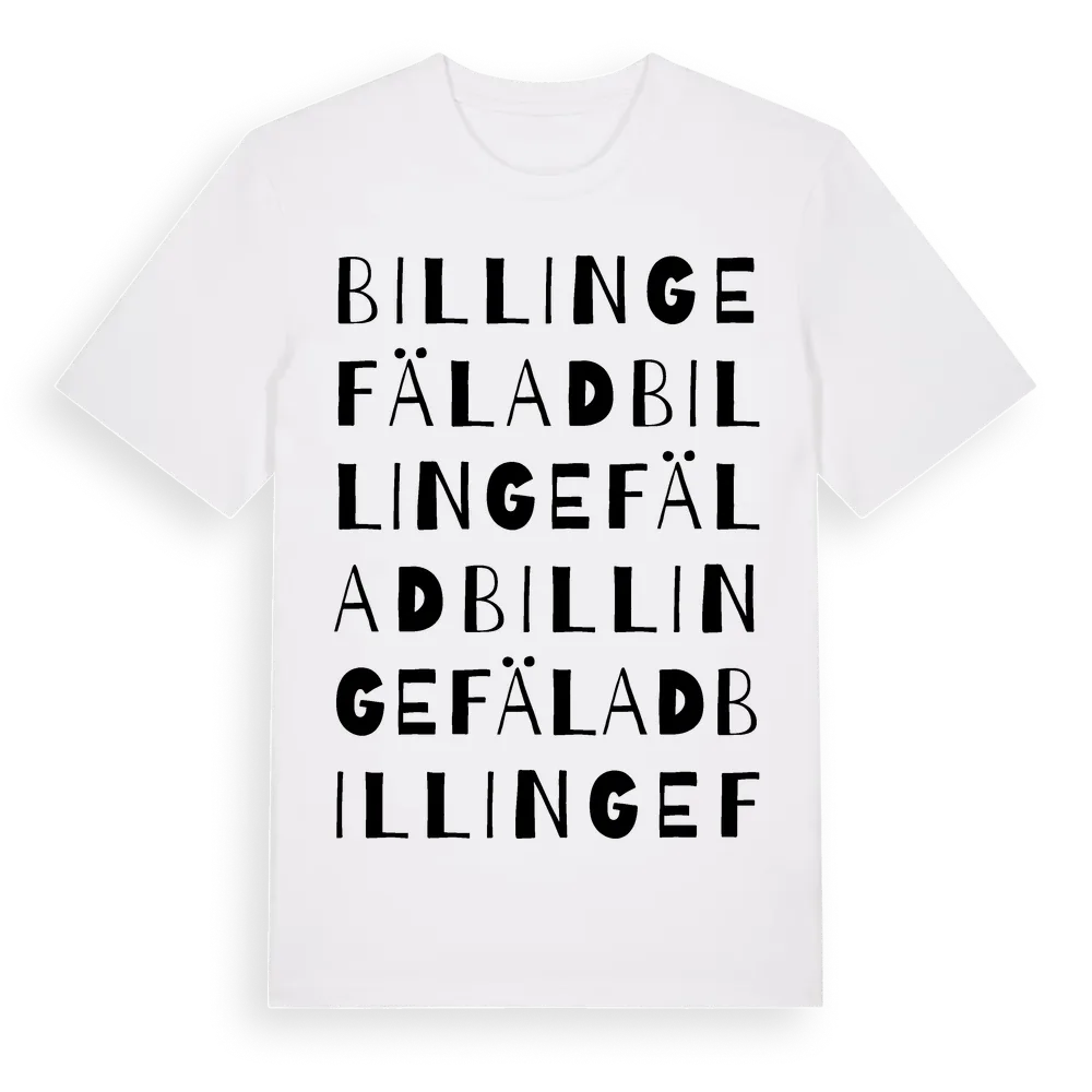 Billinge Fälad ordlek t-shirt är inspirerad av Billinge Fälad i Skåne län, Sverige. Tröjan är designad för dig som har en speciell koppling till platsen – oavsett om du bor här, har rötterna här eller bara älskar Billinge Fälad.