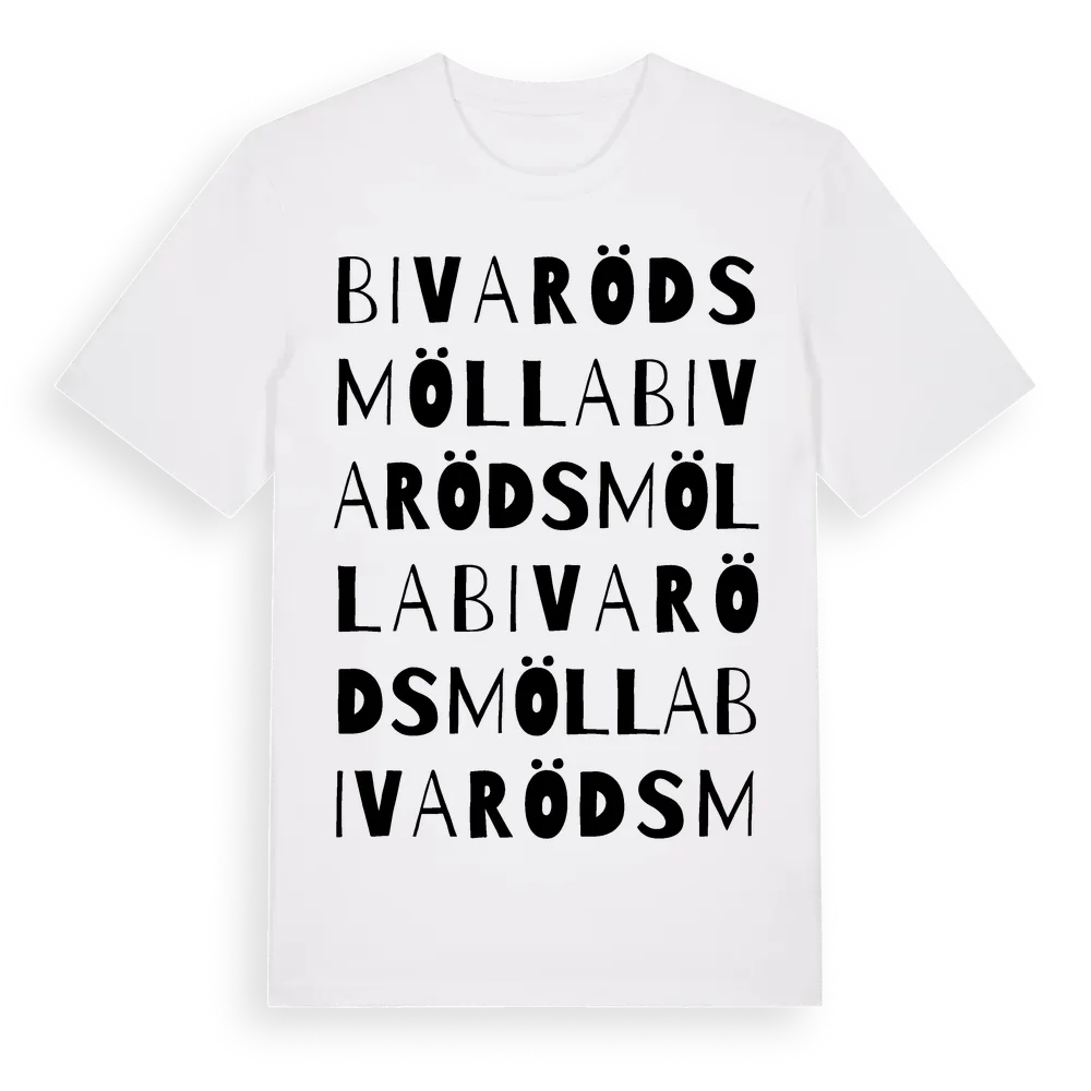 Bivarödsmölla ordlek t-shirt är inspirerad av byn Bivarödsmölla i Skåne län, Sverige. Tröjan är designad för dig som har en speciell koppling till platsen – oavsett om du bor här, har rötterna här eller bara älskar Bivarödsmölla.