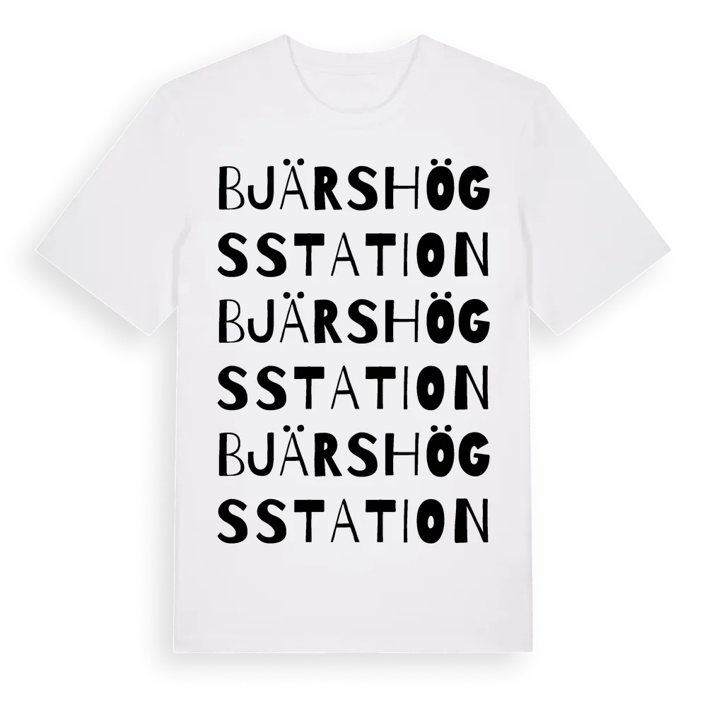En ordlek byggd på Bjärshögs Stations namn. Subtilt och klurig – ett motiv som bara de som verkligen känner platsen fullt ut förstår. Premium bomull, unisex – från byn Bjärshögs Station i Skåne län.