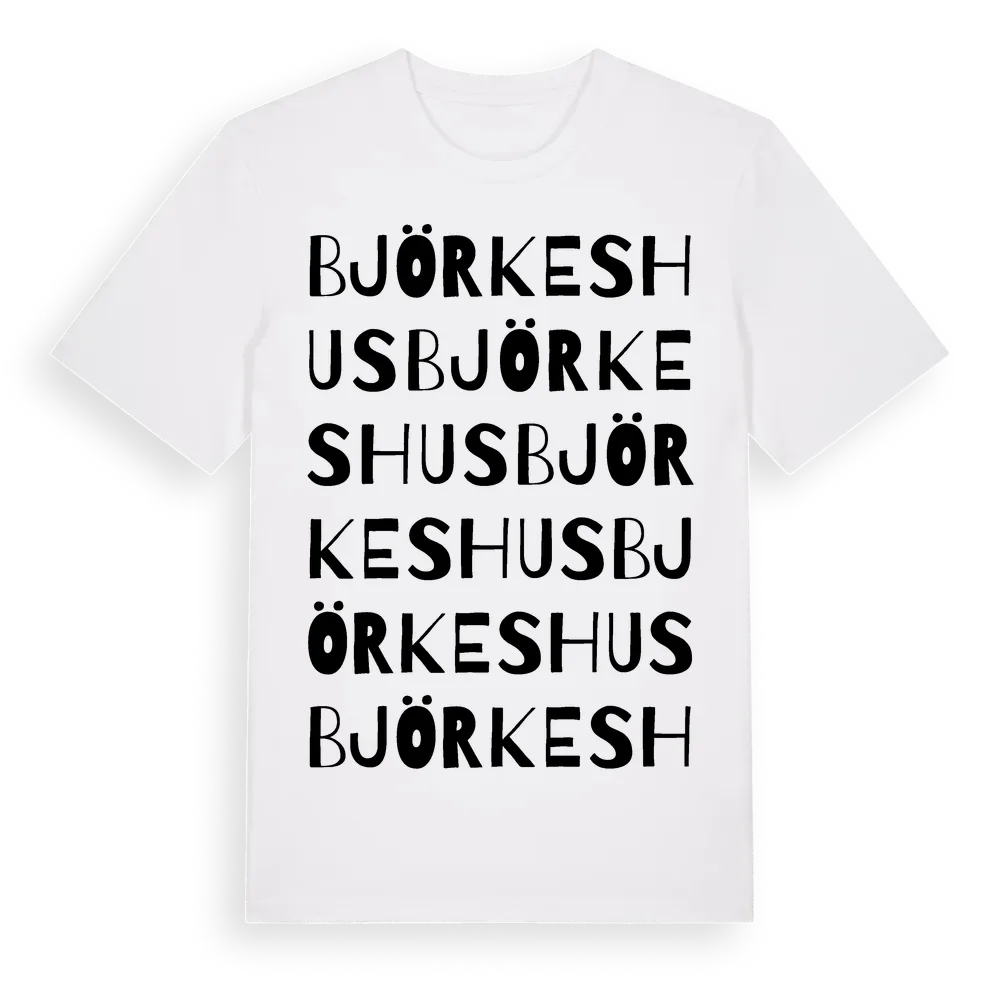 Björkeshus ordlek t-shirt är inspirerad av Björkeshus i Skåne län, Sverige. Tröjan är designad för dig som har en speciell koppling till platsen – oavsett om du bor här, har rötterna här eller bara älskar Björkeshus.