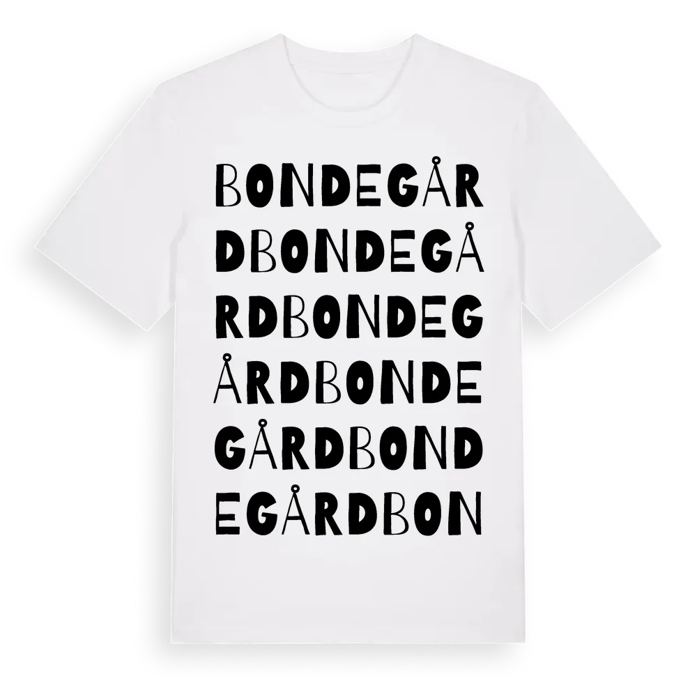 Bondegård ordlek t-shirt är inspirerad av Bondegård i Skåne län, Sverige. Tröjan är designad för dig som har en speciell koppling till platsen – oavsett om du bor här, har rötterna här eller bara älskar Bondegård.