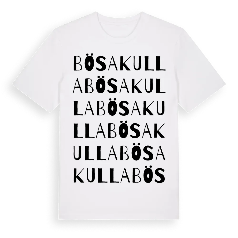 Bösakulla ordlek t-shirt är inspirerad av byn Bösakulla i Skåne län, Sverige. Tröjan är designad för dig som har en speciell koppling till platsen – oavsett om du bor här, har rötterna här eller bara älskar Bösakulla.