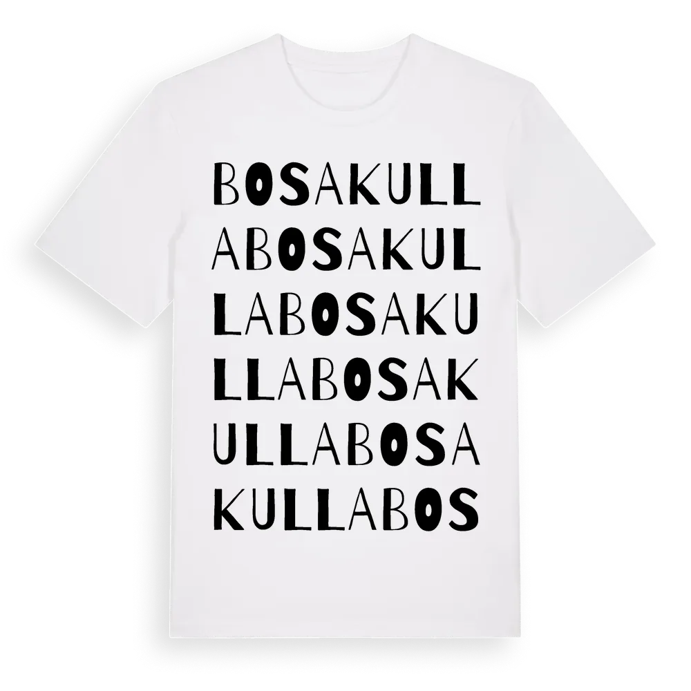 En ordlek byggd på Bosakullas namn. Subtilt och klurig – ett motiv som bara de som verkligen känner platsen fullt ut förstår. Premium bomull, unisex – från Bosakulla i Skåne län.