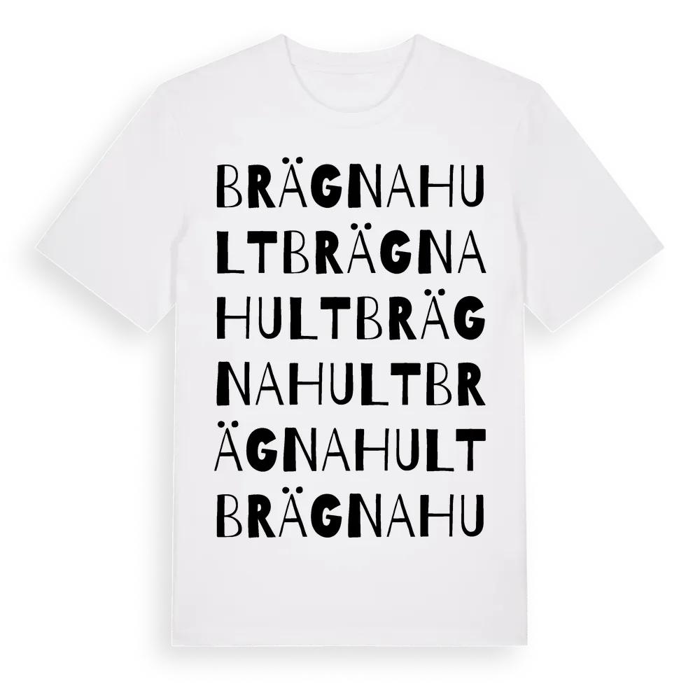 Brägnahult ordlek t-shirt är inspirerad av Brägnahult i Skåne län, Sverige. Tröjan är designad för dig som har en speciell koppling till platsen – oavsett om du bor här, har rötterna här eller bara älskar Brägnahult.