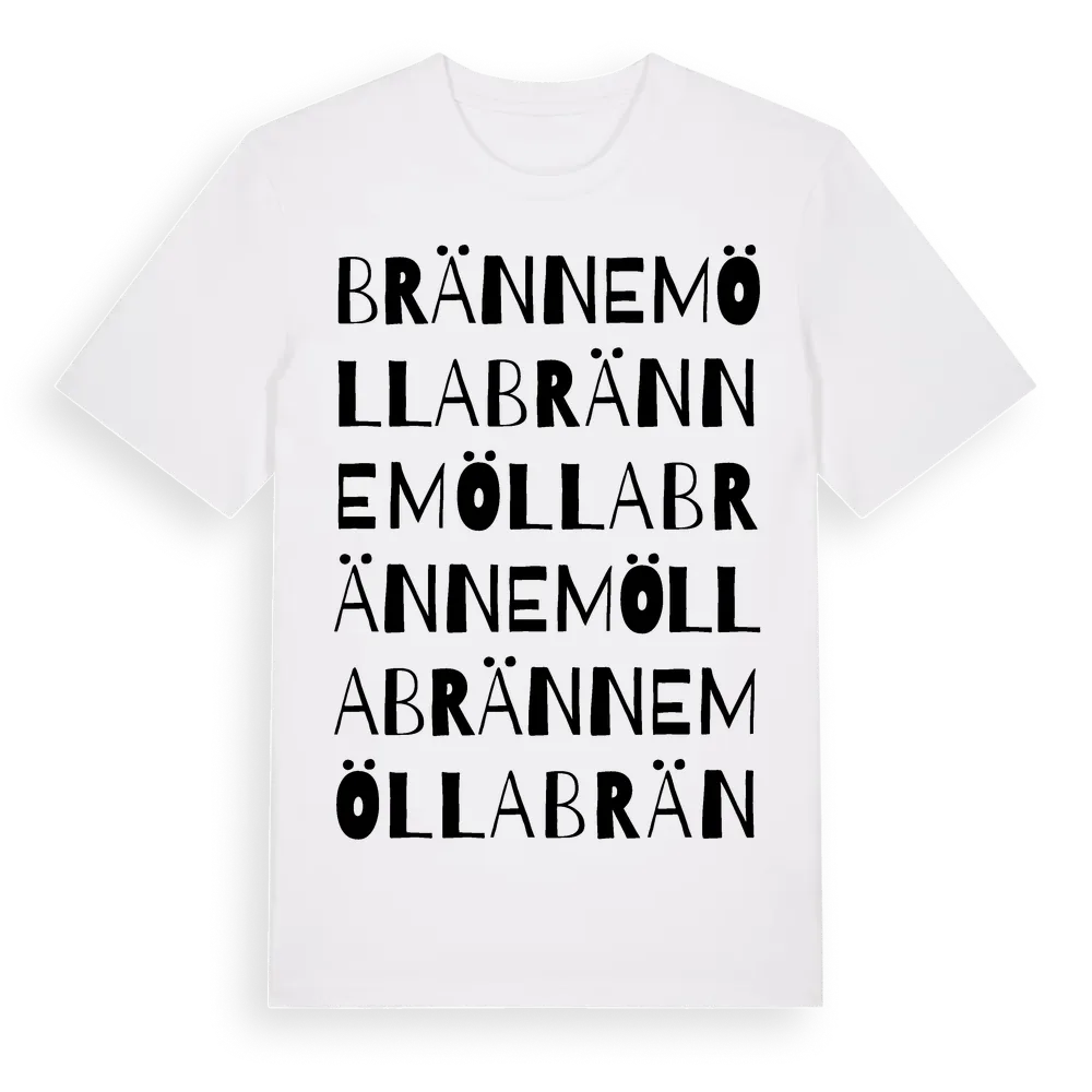 Brännemölla ordlek t-shirt är inspirerad av Brännemölla i Skåne län, Sverige. Tröjan är designad för dig som har en speciell koppling till platsen – oavsett om du bor här, har rötterna här eller bara älskar Brännemölla.