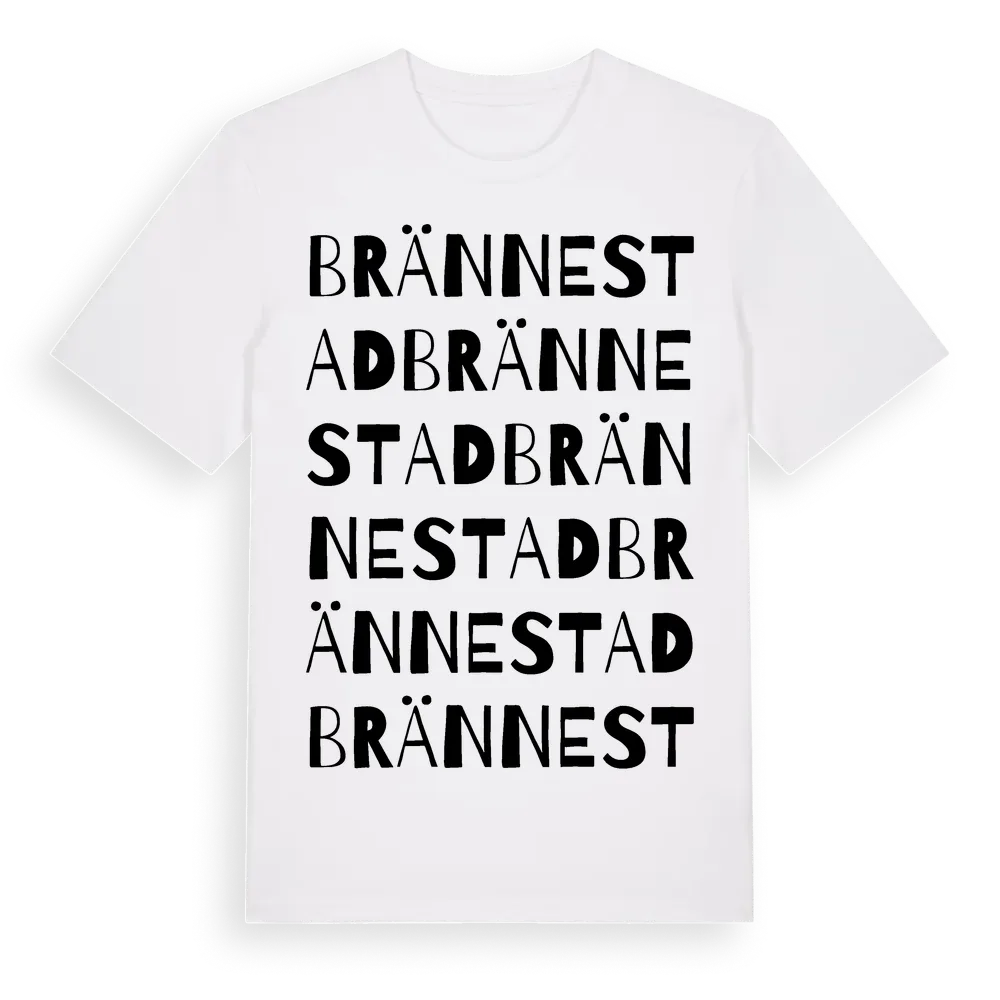 Brännestad ordlek t-shirt är inspirerad av byn Brännestad i Skåne län, Sverige. Tröjan är designad för dig som har en speciell koppling till platsen – oavsett om du bor här, har rötterna här eller bara älskar Brännestad.