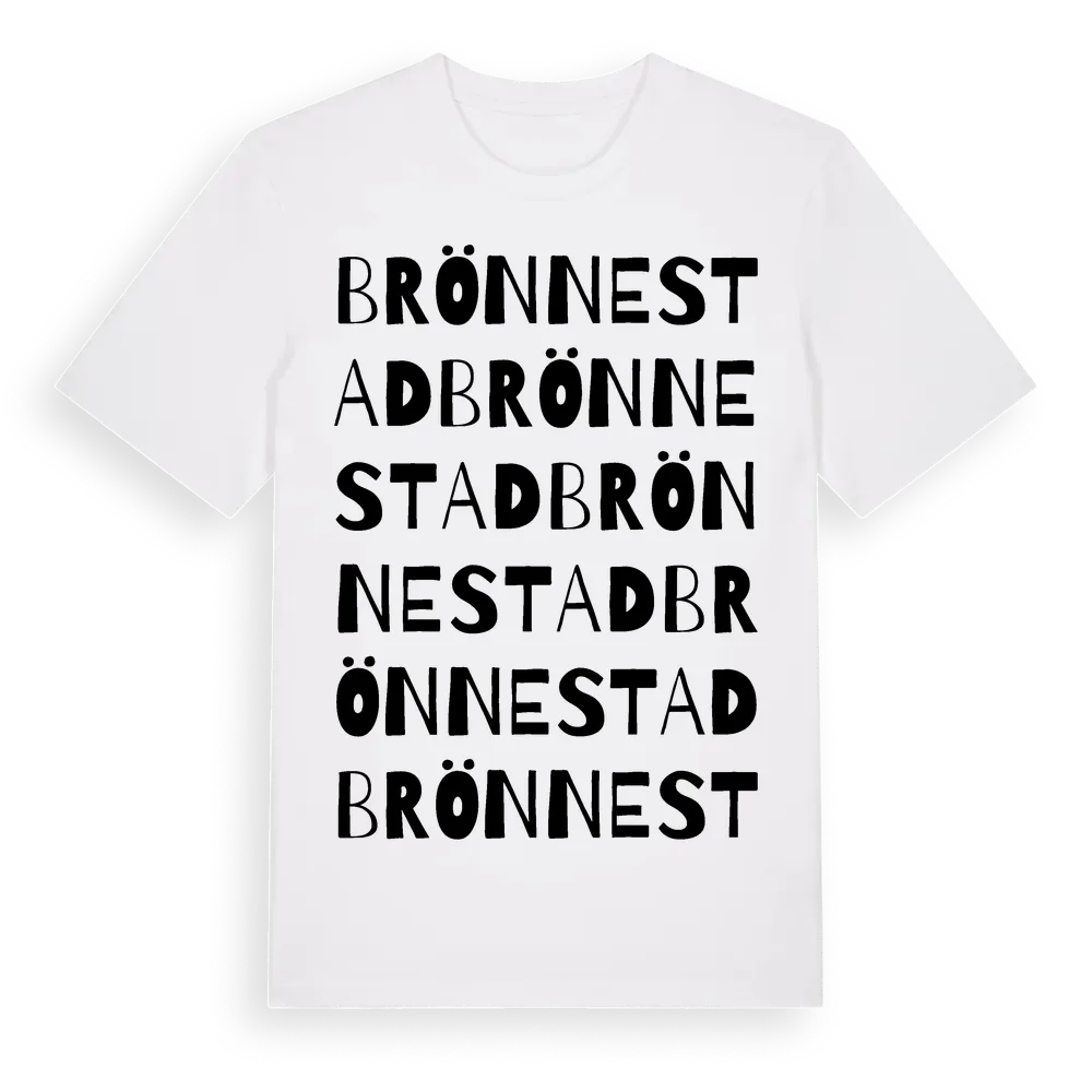 Brönnestad ordlek t-shirt är inspirerad av byn Brönnestad i Skåne län, Sverige. Tröjan är designad för dig som har en speciell koppling till platsen – oavsett om du bor här, har rötterna här eller bara älskar Brönnestad.