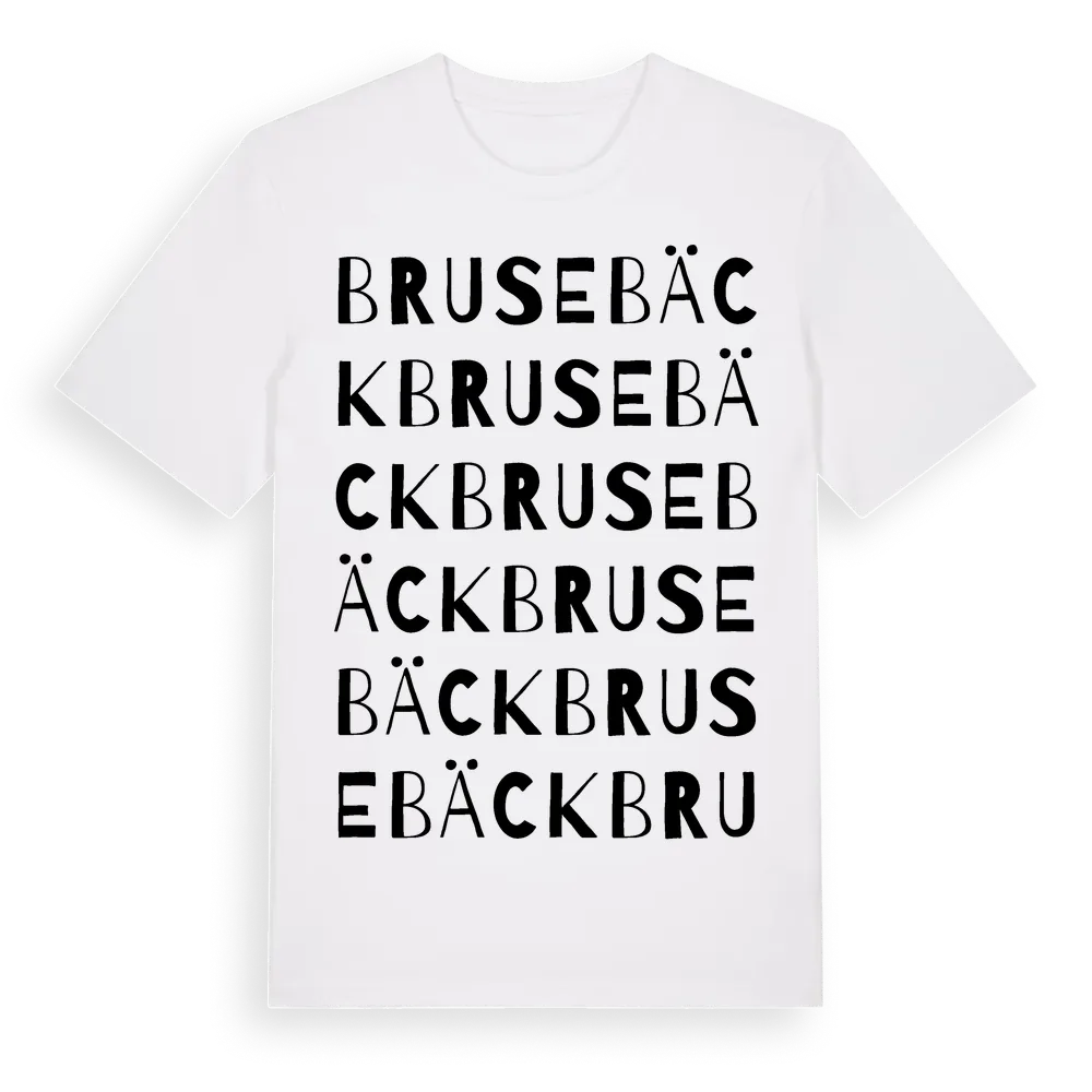 Brusebäck ordlek t-shirt är inspirerad av Brusebäck i Skåne län, Sverige. Tröjan är designad för dig som har en speciell koppling till platsen – oavsett om du bor här, har rötterna här eller bara älskar Brusebäck.