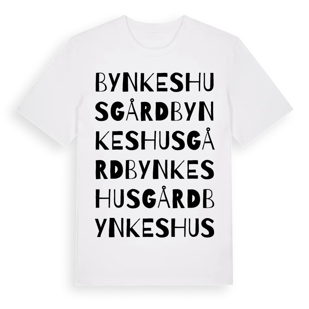 Bynkeshusgård ordlek t-shirt är inspirerad av byn Bynkeshusgård i Skåne län, Sverige. Tröjan är designad för dig som har en speciell koppling till platsen – oavsett om du bor här, har rötterna här eller bara älskar Bynkeshusgård.