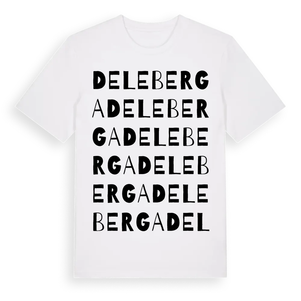 Deleberga ordlek t-shirt är inspirerad av byn Deleberga i Skåne län, Sverige. Tröjan är designad för dig som har en speciell koppling till platsen – oavsett om du bor här, har rötterna här eller bara älskar Deleberga.
