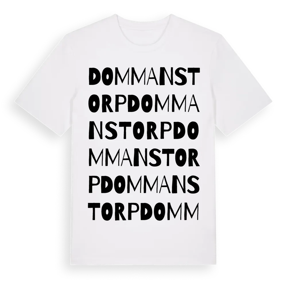 Dommanstorp ordlek t-shirt är inspirerad av Dommanstorp i Skåne län, Sverige. Tröjan är designad för dig som har en speciell koppling till platsen – oavsett om du bor här, har rötterna här eller bara älskar Dommanstorp.