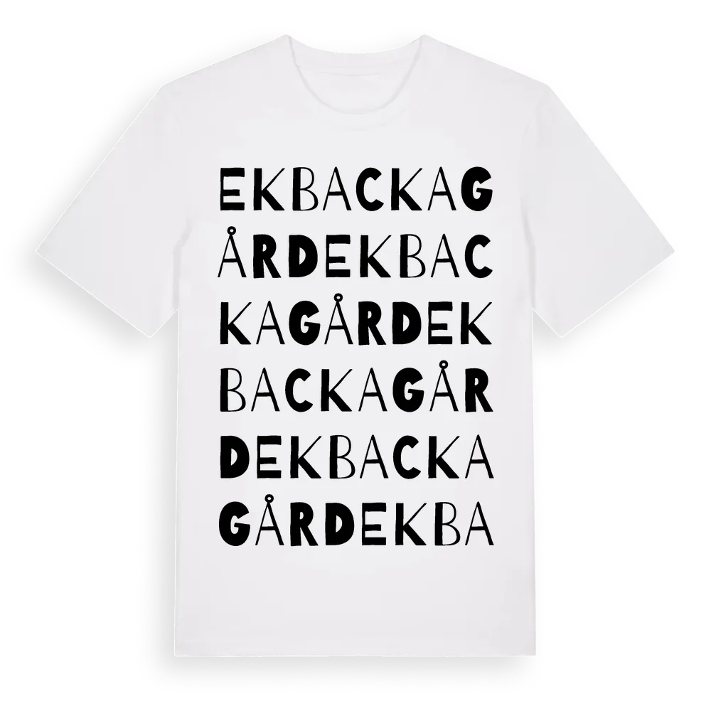 Ekbacka Gård ordlek t-shirt är inspirerad av Ekbacka Gård i Skåne län, Sverige. Tröjan är designad för dig som har en speciell koppling till platsen – oavsett om du bor här, har rötterna här eller bara älskar Ekbacka Gård.