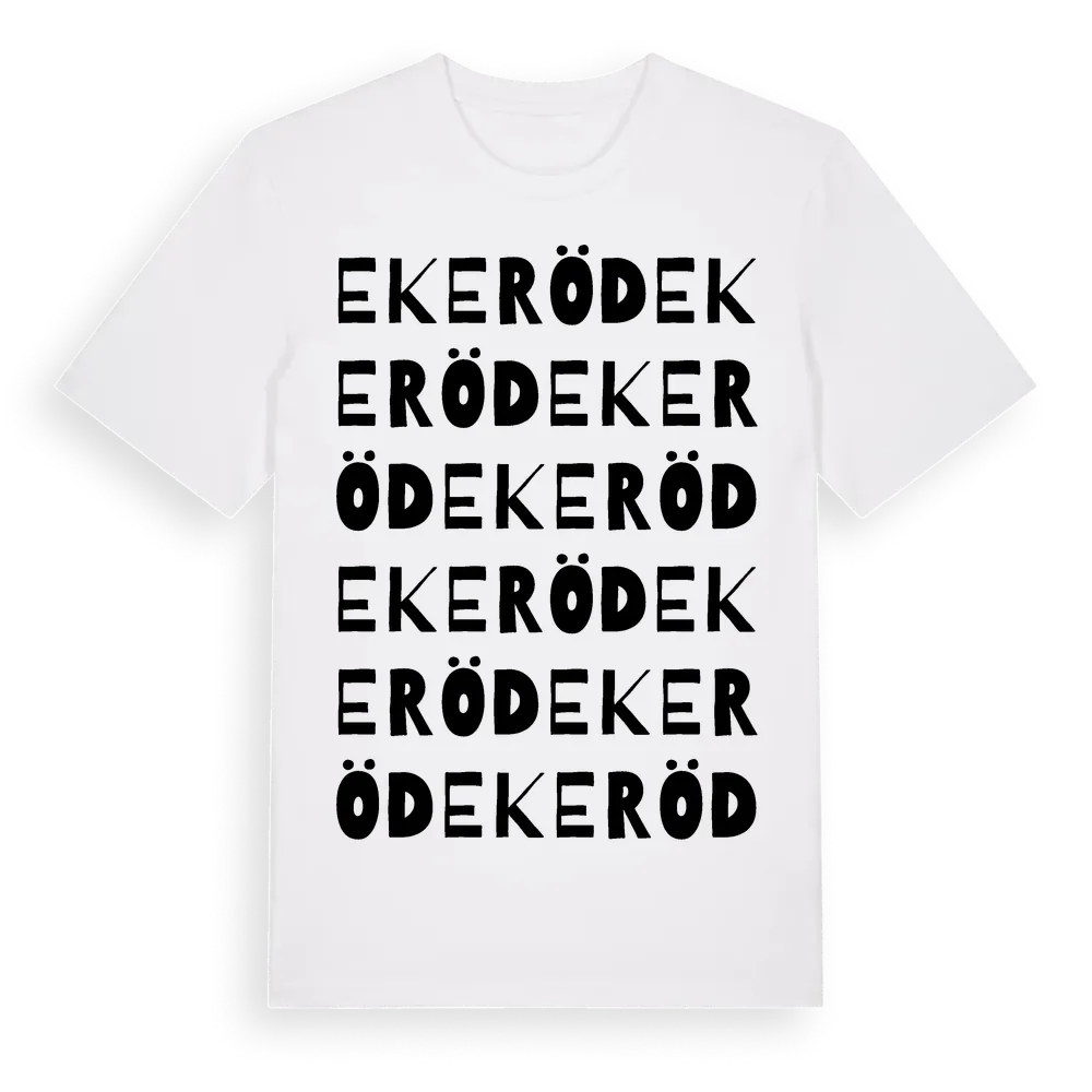 Ekeröd ordlek t-shirt är inspirerad av byn Ekeröd i Skåne län, Sverige. Tröjan är designad för dig som har en speciell koppling till platsen – oavsett om du bor här, har rötterna här eller bara älskar Ekeröd.