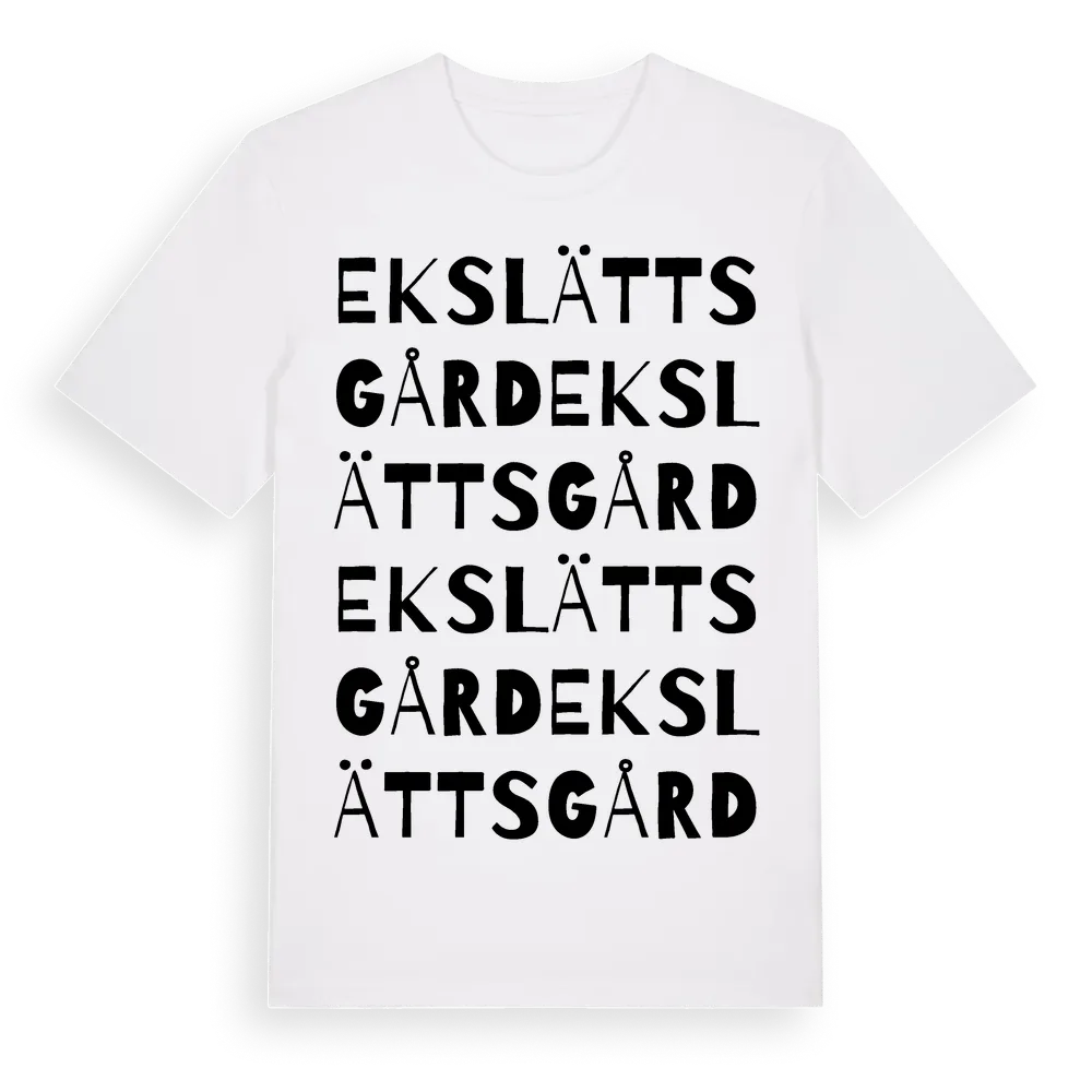 Ekslättsgård ordlek t-shirt är inspirerad av Ekslättsgård i Skåne län, Sverige. Tröjan är designad för dig som har en speciell koppling till platsen – oavsett om du bor här, har rötterna här eller bara älskar Ekslättsgård.