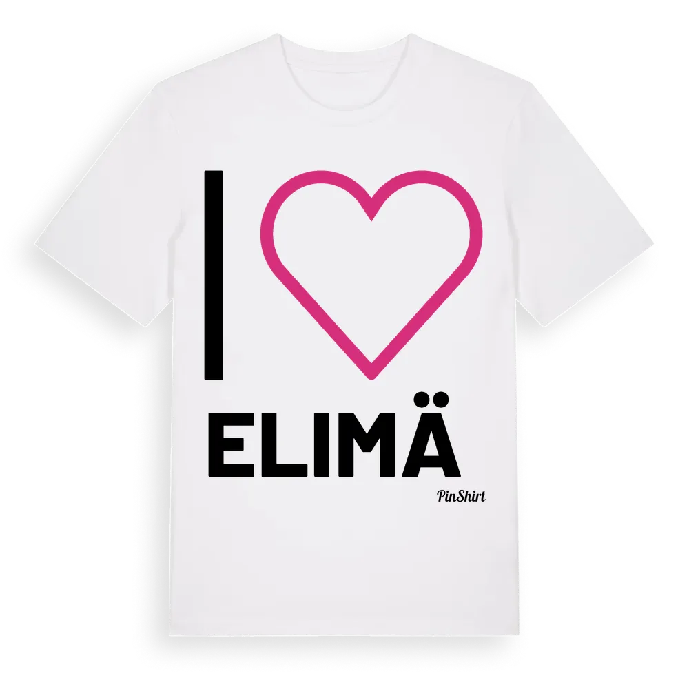 Det klassiska "I ❤ Elimä"-motivet i stort format som täcker hela bröstet. För dig som vill visa kärleken till Elimä på riktigt. Premium bomull, unisex – från Elimä i Skåne län.