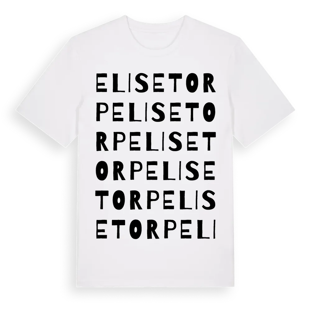 Elisetorp ordlek t-shirt är inspirerad av byn Elisetorp i Skåne län, Sverige. Tröjan är designad för dig som har en speciell koppling till platsen – oavsett om du bor här, har rötterna här eller bara älskar Elisetorp.