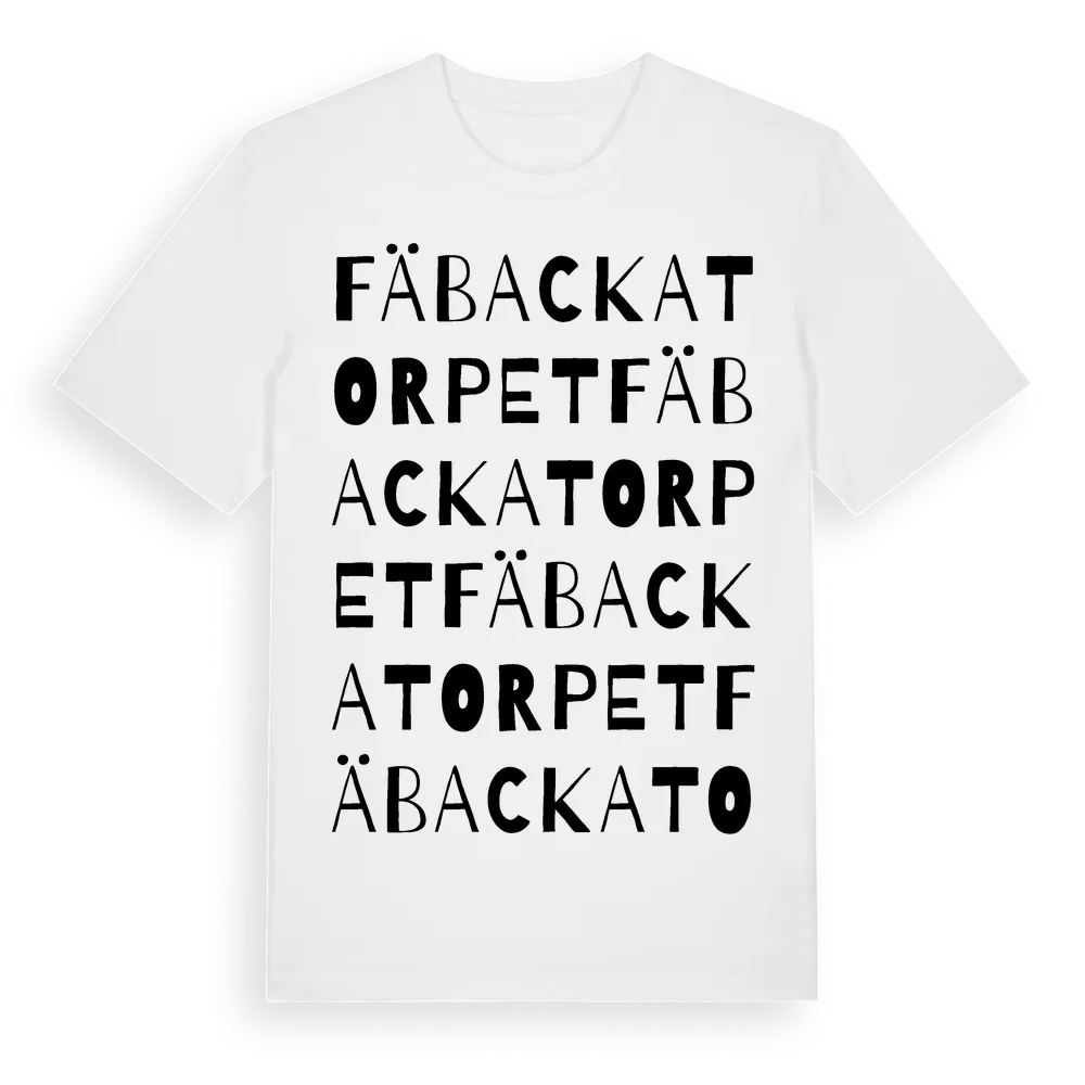Fäbackatorpet ordlek t-shirt är inspirerad av Fäbackatorpet i Skåne län, Sverige. Tröjan är designad för dig som har en speciell koppling till platsen – oavsett om du bor här, har rötterna här eller bara älskar Fäbackatorpet.