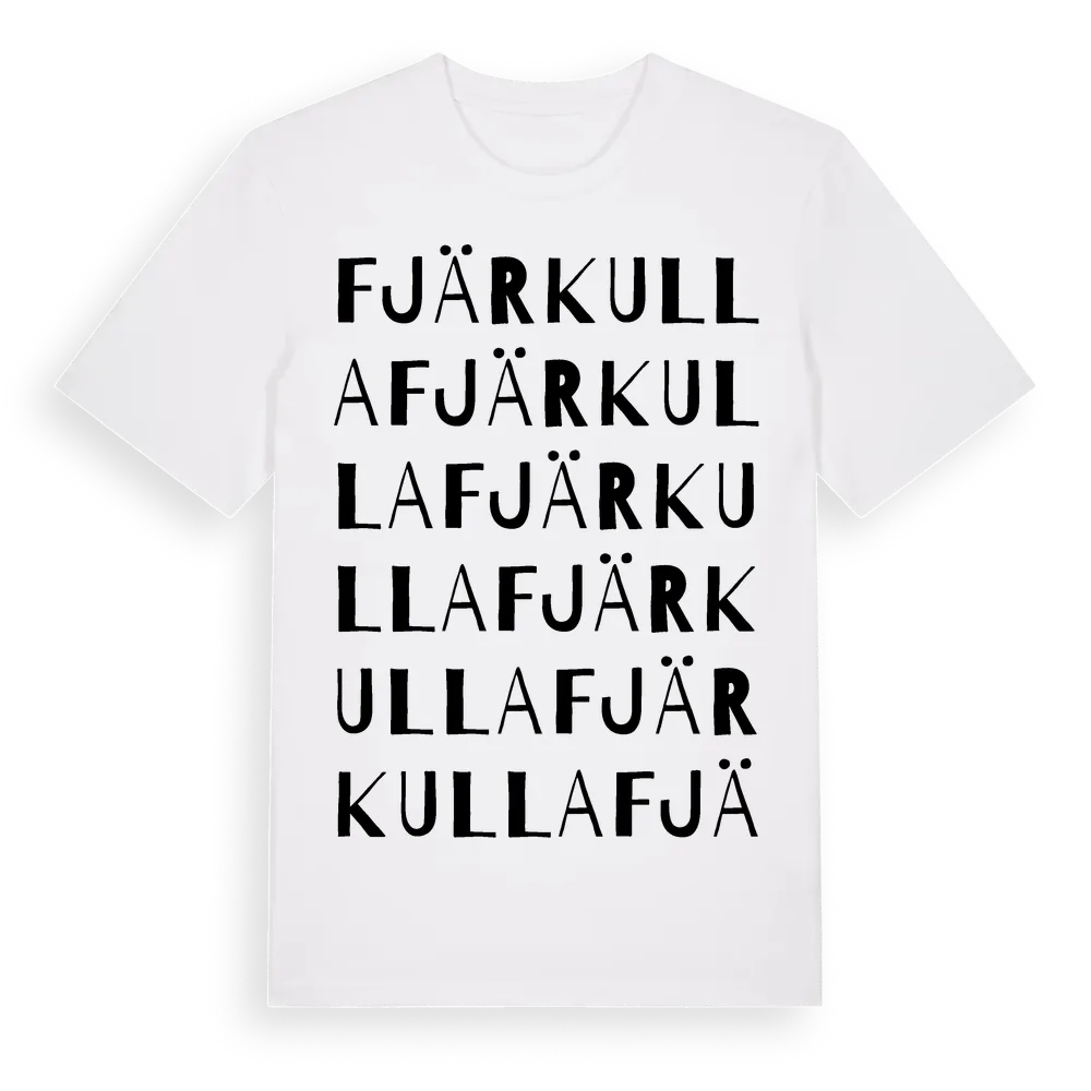 Fjärkulla ordlek t-shirt är inspirerad av byn Fjärkulla i Skåne län, Sverige. Tröjan är designad för dig som har en speciell koppling till platsen – oavsett om du bor här, har rötterna här eller bara älskar Fjärkulla.