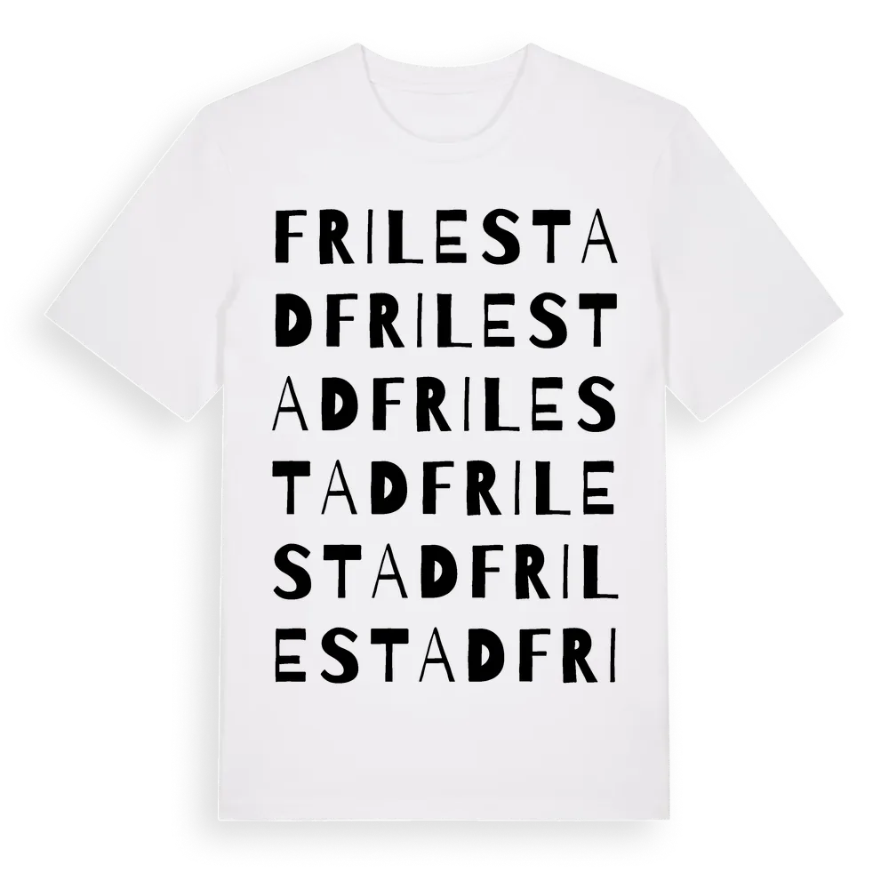 Frilestad ordlek t-shirt är inspirerad av Frilestad i Skåne län, Sverige. Tröjan är designad för dig som har en speciell koppling till platsen – oavsett om du bor här, har rötterna här eller bara älskar Frilestad.