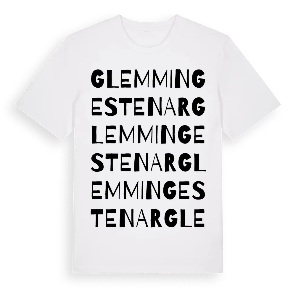 Glemminge Stenar ordlek t-shirt är inspirerad av byn Glemminge Stenar i Skåne län, Sverige. Tröjan är designad för dig som har en speciell koppling till platsen – oavsett om du bor här, har rötterna här eller bara älskar Glemminge Stenar.